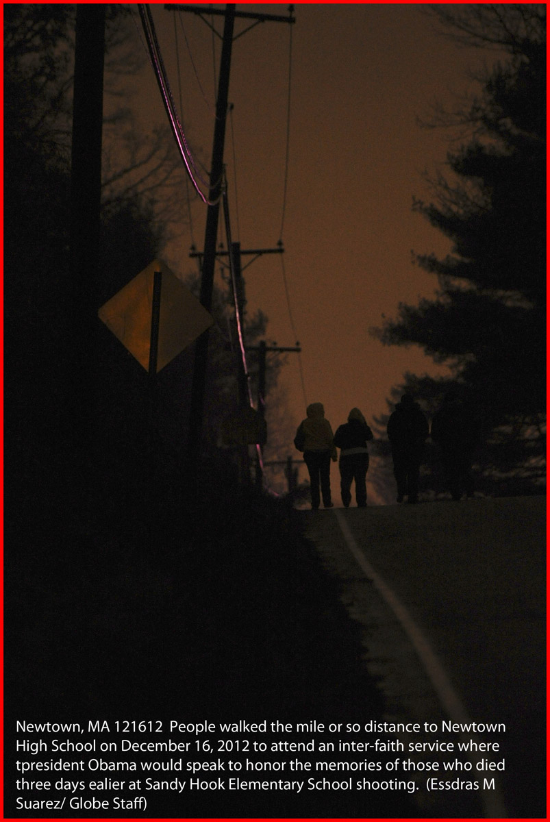 Newtown, CT 121512 One day after a man walked into Sandy Hook Elementary and killed 20 children and several adults, residents and people from near and afar have come to this sleepy town to pay their respects to the fallen victims. (Essdras M Suarez/ Globe Staff) BEHIND THE SCENES: I'm still sticking to my guns of respecting my photographic subjects by giving them space. However, this can not be said by the majority of members of the media who have come to Newtown, CT. Today we were allowed at an Episcopal church for a "Healing Prayer" service and there were more media than parishioners. Photographers and video camera operators alike traipse about each other in the middle of the service while getting as close as possible to those trying to grieve. I stayed in one spot along with another photographer from another paper. She too was pretty disgusted with the photographers' behavior. I have decided showing respect for others is far much more important than getting the photo. TECH STUFF: same as always two camera bodies, two lenses, one teleconverter.